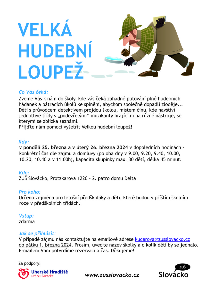 Děti ze školek si mohli užít pětačtyřicetiminutový program nazvaný Velká hudební loupež. Průvodce/detektiv (pedagog ZUŠ Slovácko) je vzal na záhadné putování plné hudebních hádanek a pátracích úkolů, při kterých děti obešly jednotlivé učebny s "podezřelými" muzikanty hrajícími na různé nástroje, se kterými se zblízka seznámily Nechybělo drobné tvoření a desetiminutový koncertík mladších žáků.