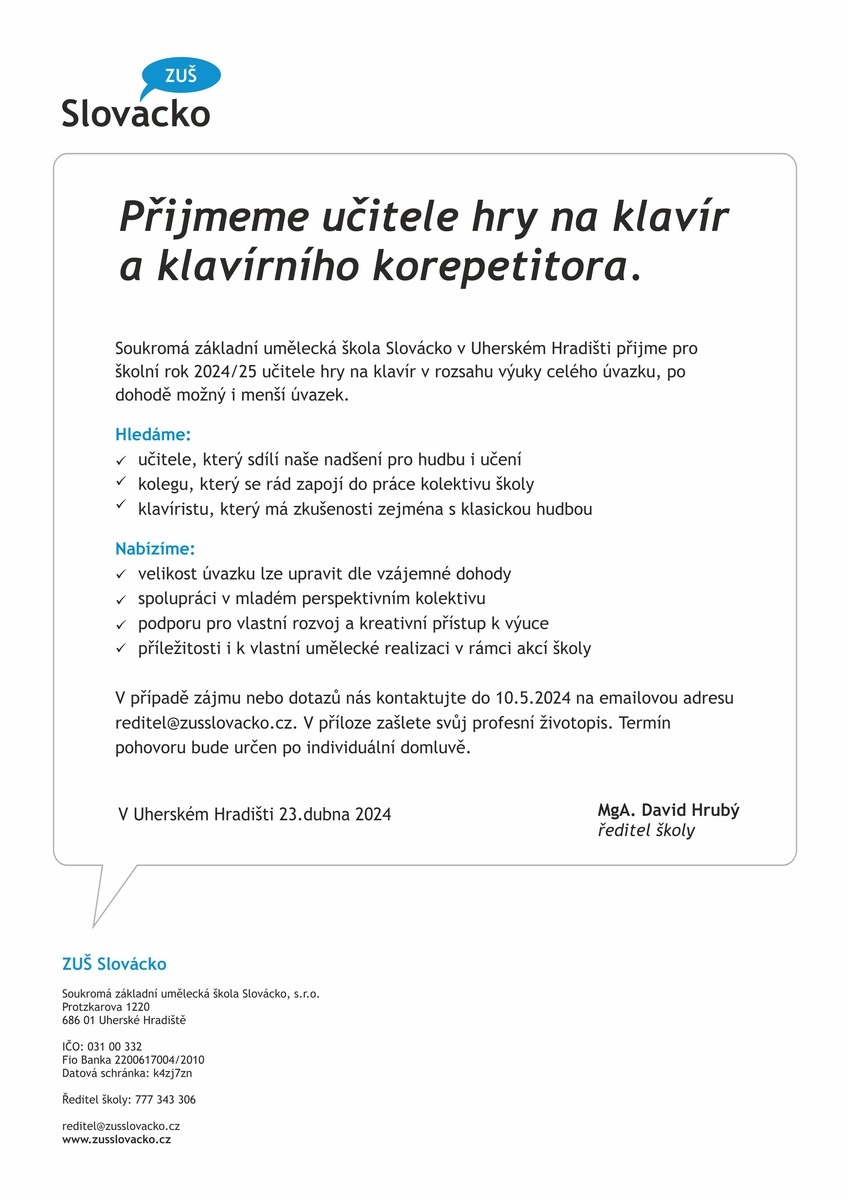 V případě zájmu nebo dotazů nás kontaktujte do 10.5.2024 na emailovou adresu reditel@zusslovacko.cz. V příloze zašlete svůj profesní životopis. Termín pohovoru bude určen po individuální domluvě.